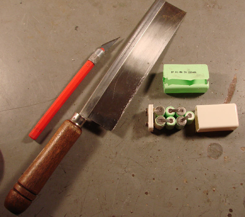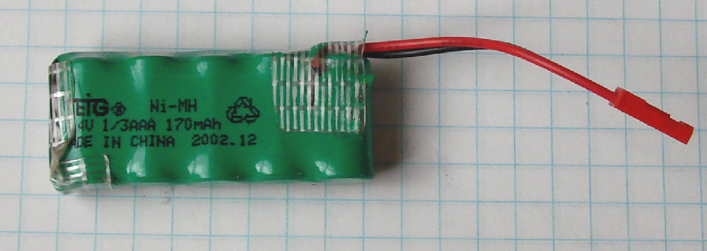By using 5 cells from a NiMH 9 volt 'transistor' battery, the weight of the lighting battery could be reduced even further to about 3/4 ounce, and the size of the battery pack can be reduced. The Turnigy NiMH '9 volt transistor' battery, available from http://www.allelectronics.com, is rated at 250 mAH- this offers good energy density in a lightweight cell. The pale green covered BP battery shown in the photo below is rated at 220 mAH. I bought this battery from http://www.circuitspecialists.com