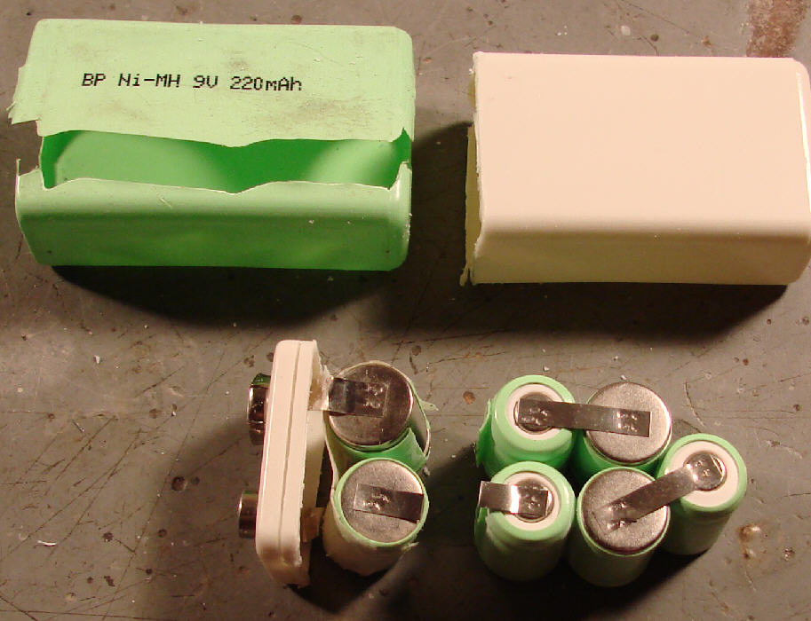 These 9 volt batteries have plastic cases which are glued closed. After cutting away the outer shrink-wrap cover, you can open the case by carefully cutting with a Zona Saw about 3/32" below the glue joint.