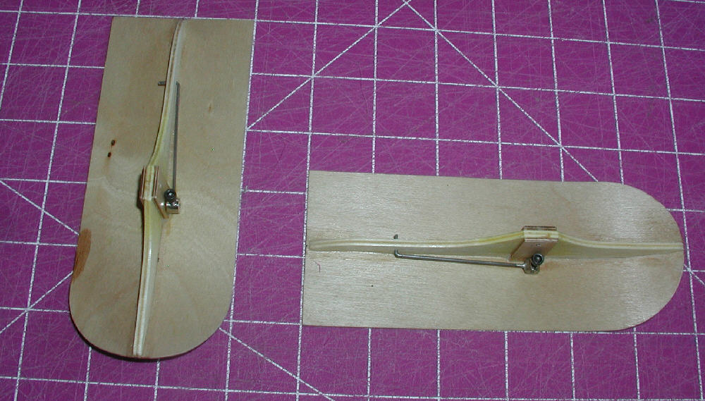 The floats were then cut out, carved to give a bit of aerodynamic streamlining, then covered with 3 mil 'DocuLam' laminating film. The film was left extended about 3/8" above the edges of the upper mounting surface (with overlaps forming two layers on the bottom ski running surface). After covering was complete, and the mounting area on the underside of the wing was overlaid with a layer of the laminating film too, the skis were each positioned and held in place on the bottom of the wing while the 3/8" wide flaps of laminating film were ironed onto the wing's lower surface. This is enough to hold the skis in position; in this way they are easily removable so that wheel gear might be mounted later, yet the laminating film is so tough that they are held very solidly in place.