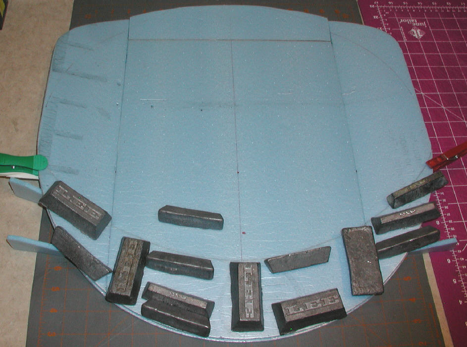 [B]Glueing the panels together[/B]: I prefer to use a light coat of 5 minute epoxy for this job- it sets up fairly fast, but not too quickly. After test-fitting to verify that the panels fit together well, I mix & apply the thin coat of epoxy to the lower wing panel, and then weight down the upper panel thoroughly, with two of the 19 degree wedges in place supporting each raised wing tip panel. I add weights to keep the panels closely mated while the epoxy sets up.(The top panel was actually set back 3/32" from the main panel to start the leading edge contouring process; later, carving with a razor knife was done before the heat-shaping and tempering of the foam was finished with a covering iron.)