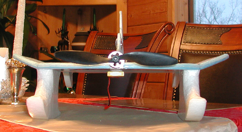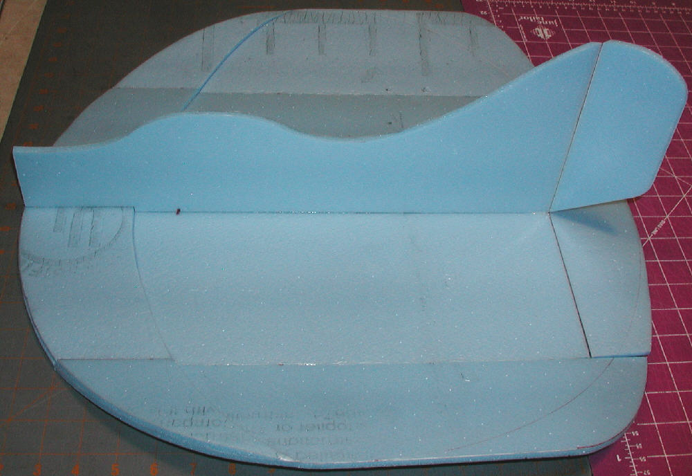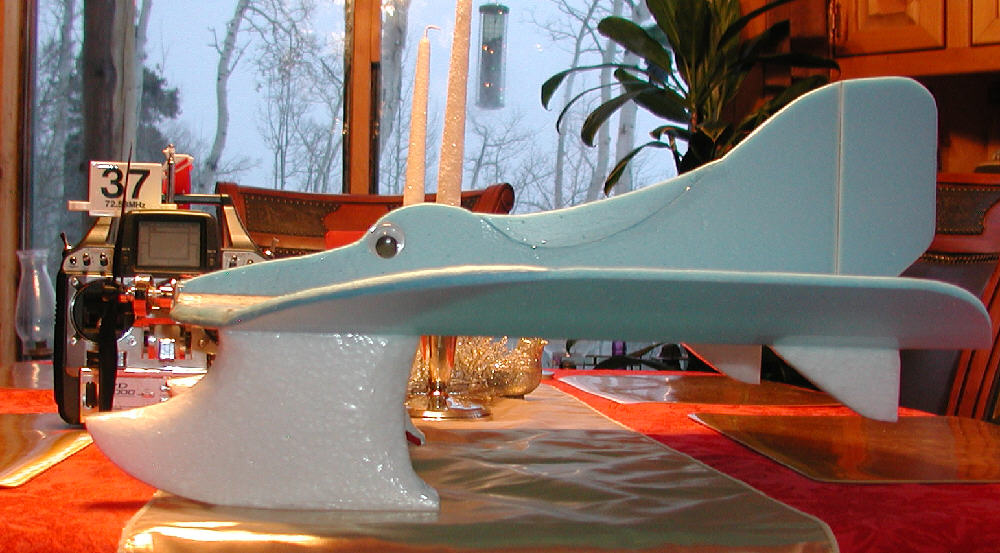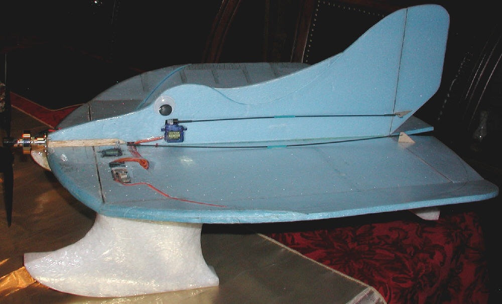 Above: Foam was cut oversize for the first prototype of the upper fuselage, offering the possibility of mounting the motor well above the wing so that shorter landing gear or lower profile skis might be used. I then chose next to cut down some of the extra upper fuselage foam, and to mount the motor just above the center line of the wing, since I firmed up my plans to use the taller profile EPP skis.
