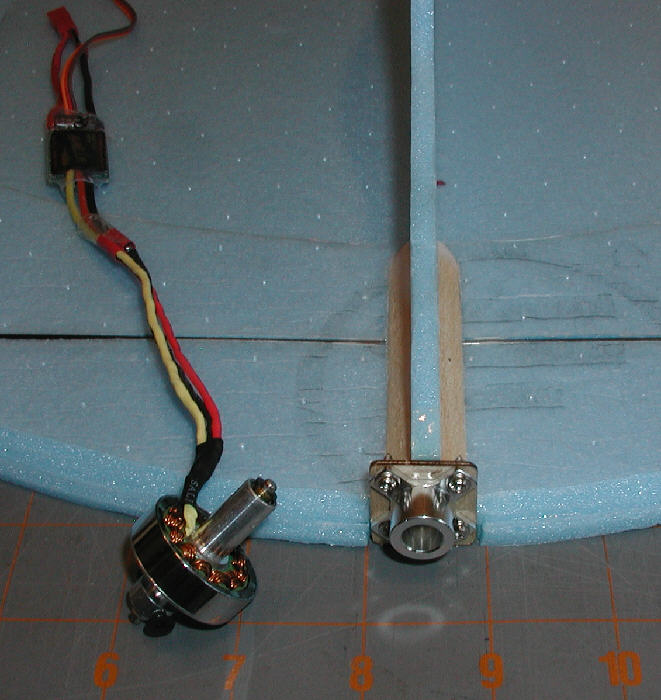 Above: C20 1500Kv motor ready for testing, and it's firewall mount in place with four servo screws. (I used a dremel tool to open up the center hole in the firewall further to be sure to clear the rear end of the motor shaft nicely.)