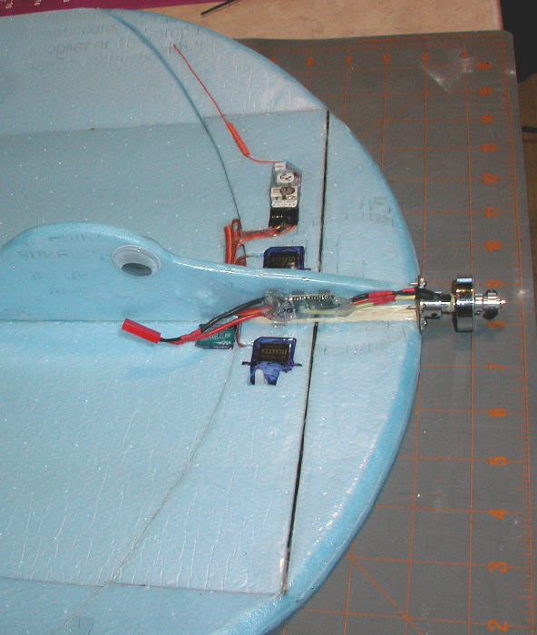 Next, the servos were inset within the two layers of Bluecor PP, and the Corona radio receiver was also inset into a recess cut into the upper layer of the double thickness foam. The Receiver's antenna was modified into a 'base loaded coil' shortened configuration. (I'm flying this modified antenna setup successfully on about a dozen aircraft or more at this time- it works great!)