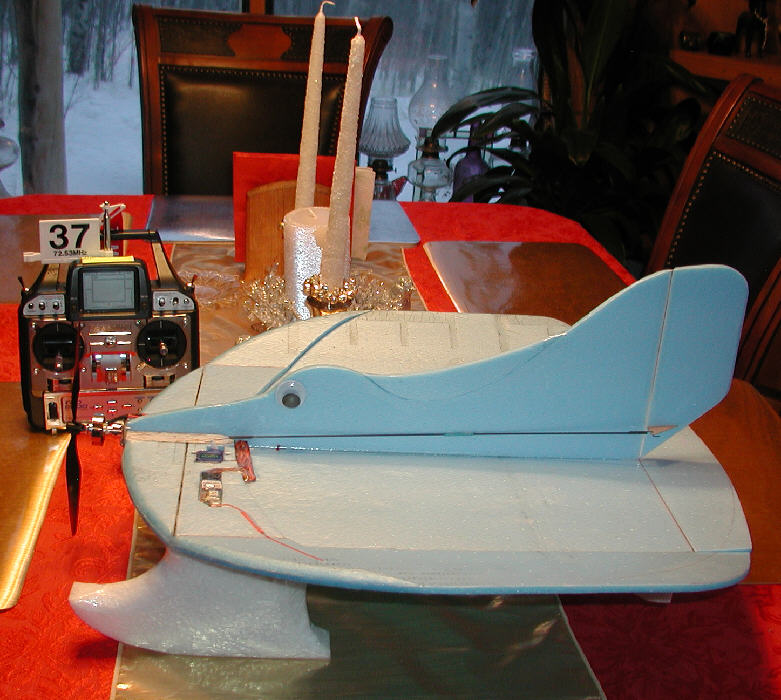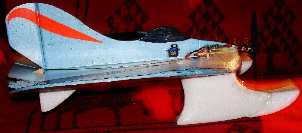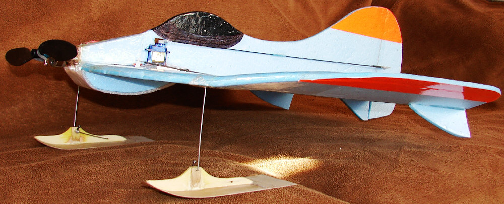 The result is what you see in the photos. Airframe total weight is 7 Oz without the battery; with a 2S 460 battery, the flying weight is at 8 ounces, for a wing loading of 3.5 ounces per square foot. It now balances for flying with the battery about 1-1/4" to the rear of where it mounts when flying without the float/skis, still within the battery compartment.