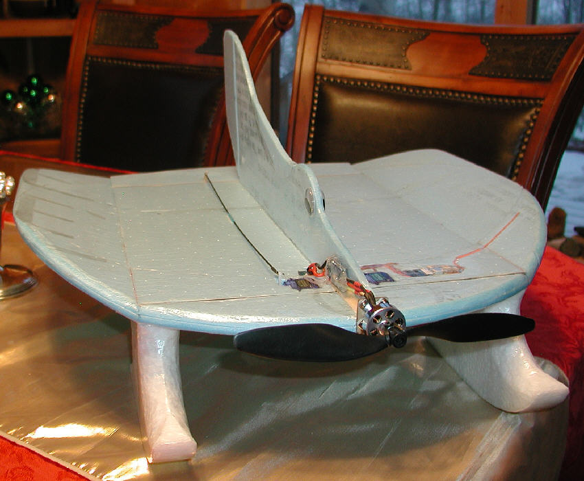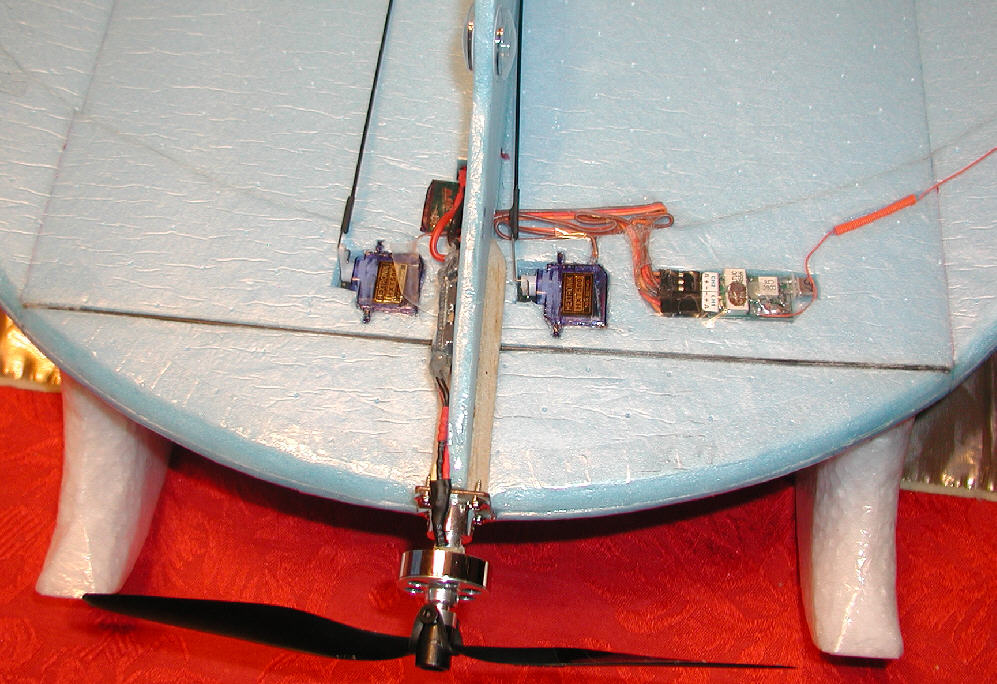 Servos: two HXT500 for elevator and rudder (Later added a third servo to implement elevon control)
