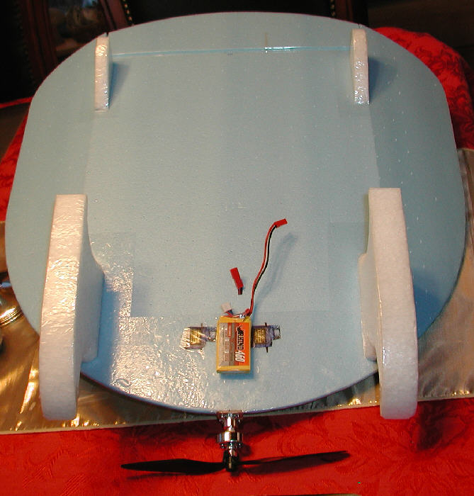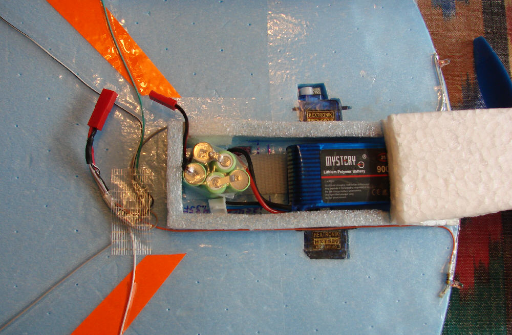 Above: For the first test flight, the 2S 460 mAH battery pack is mounted on velcro on the underside of the wing, as shown, to balance the aircraft at the proper C.G. (Starting C.G. is good at 5" back from the center leading edge of the wing- 25% of total wing length.)