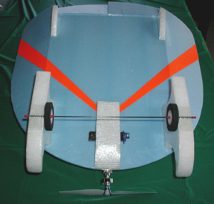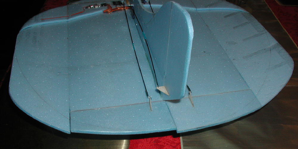 Having the center panel width at 60% of total span, with each wing tip panel at 20% of total span, and the wing tips set at 20 degrees dihedral seems to be a good balance for flying with both elevons & rudder. The result is a fun flier which responds well to the rudder for great ground / water handling, and which also rolls fairly axially in the air and can fly inverted easily when using the elevons. (The widened trailing edge of the wing, and the wider % center panel allows for more elevon area.)