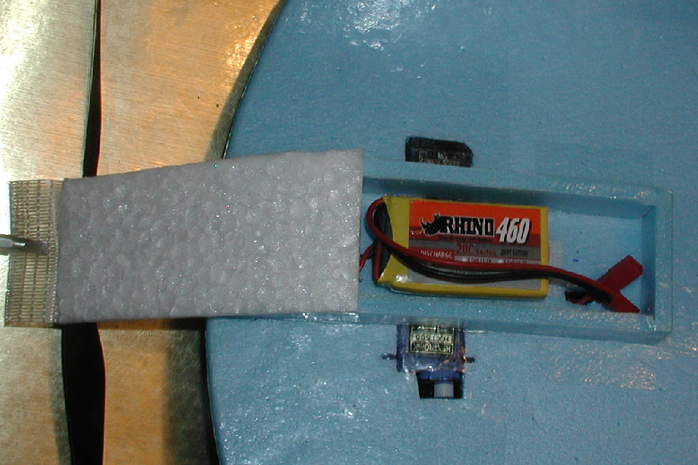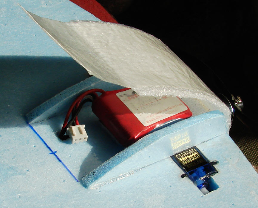 On my SNOWBALL, the battery fits snugly into a compartment in the lower part of the EPP motor mount block, with a thin foam side cover that simply tapes in place for colder weather flying, and that works well. On this one, I'm thinking of making a compact battery compartment on the wing's underside that can enclose the battery, while having some room to allow for flying a larger (2S 900 mAH?) battery, or to shift the velcro-mounted battery a bit forward to adjust the C.G.