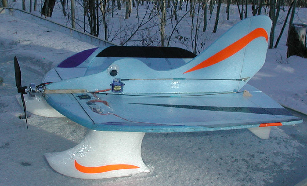 Keeping it sized & constructed in a form to be rugged enough for all-terrain flying, yet to be light enough to perform well on a 24 gram motor & 2S battery was a primary design concept. (When flying with floats & with the larger 2S 900 battery at 8-5/8 oz., it's only 59% of the 14.5 oz. weight of my 24" Snowball.) The rudder provides great ground /water / snow handling control authority, while the elevons provide precise roll axis control.