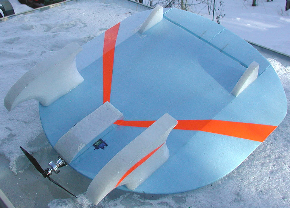 The back quarters were morphed wider on the 20" disc to add an extra ~16 square inches of surface area, for 2.29 square feet total. With a flying weight (after the colored trim was added) when flying on these EPP skis of only 7.75 ounces, the wing loading is only 3.38 ounces per square foot.