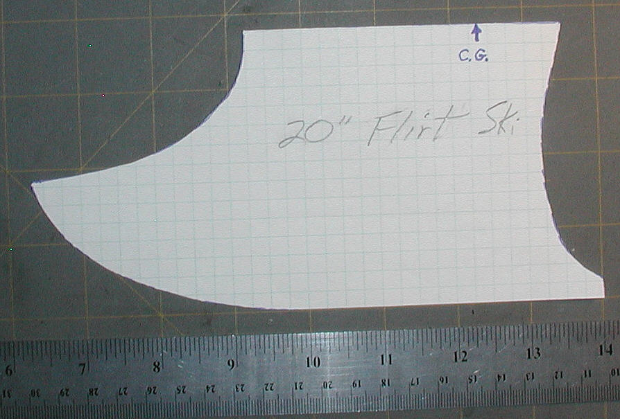 For the flirt, I wanted to keep weight to a minimum while having a tough and durable ski setup. (I was not designing these EPP skis for water flying at the time, although they may also handle well from water, too.) I started with a scrap block of 1.3# density EPP, laid out the bottom contour, then decided on the height that would rusult in adequate prop to snow clearance. Since the block of foam which I started with was ~2.5" thick, I ended up with a pair of skis at ~1-1/4" wide.