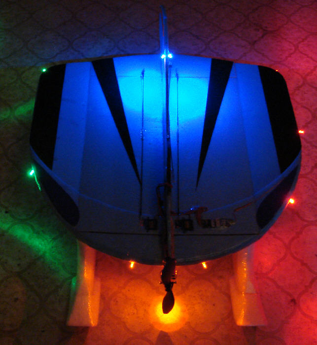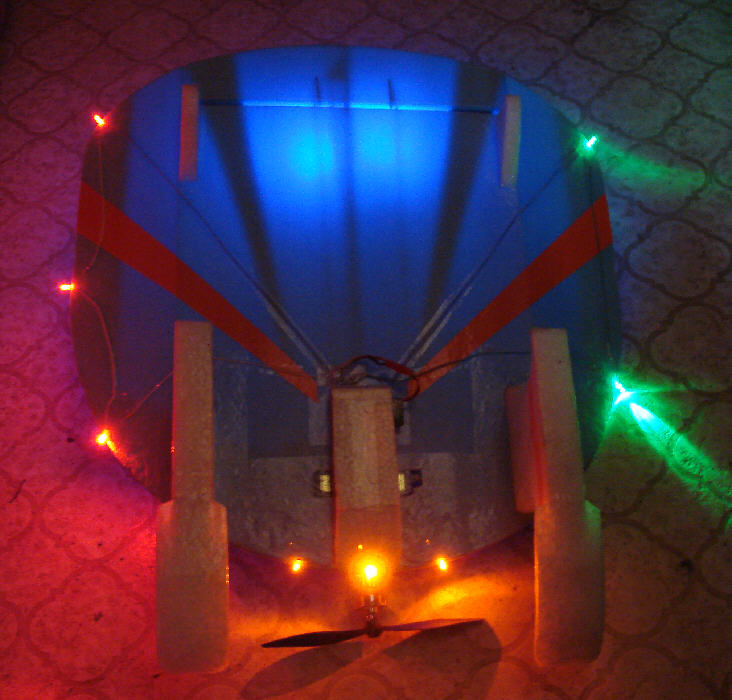 The results are seen in these photos, photographed in subdued lighting; they certainly are plenty bright for night flying purposes, yet are drawing a total of only 63.4 mA on a fully charged battery. (These high intensity LEDs do not need to be driven at the maximum allowable current of 20 mA each to produce a lot of output- they have very high output ratings- especially the red ones!)