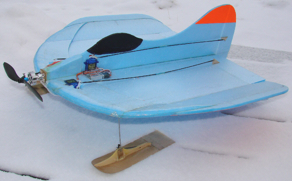 (Below:) Here's a look at the other Flirt variant ready to fly on 1/32" birch ply skis after the modification of the wing tip panels, the extension of the rudder below the wing, and the addition of the battery enclosure. You can also see the three under-tail fins which keep the elevons up off the ground, and protect the extended rudder's lower end from ground strike damage.