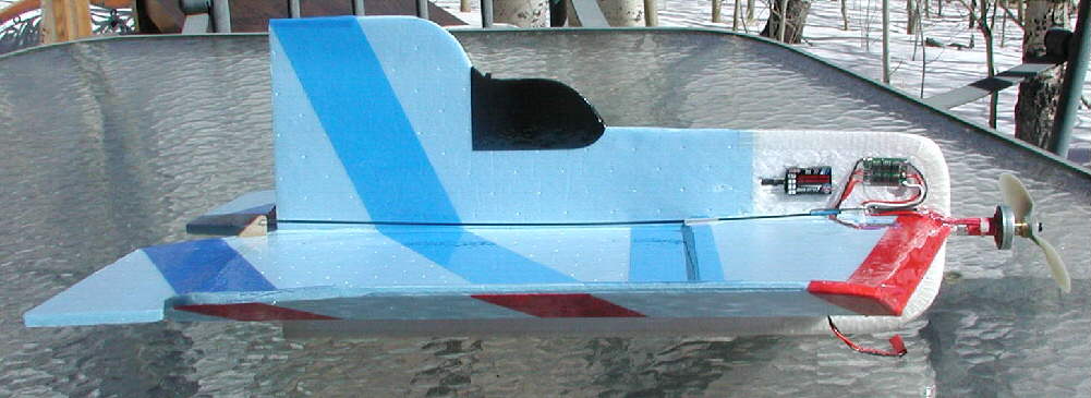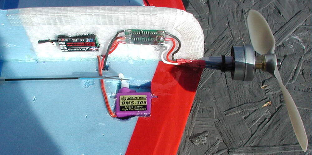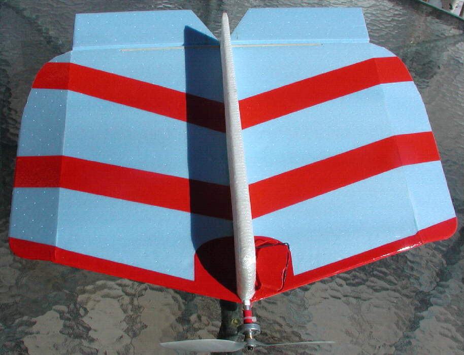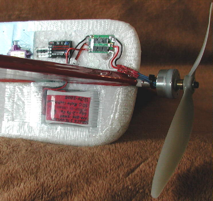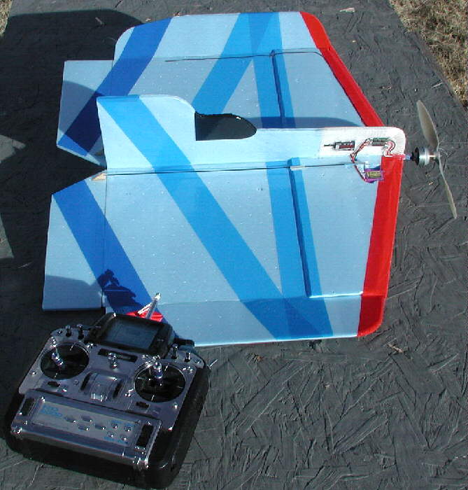 These photos show my "HOOT" before the first flight; it was about flight-ready when these were taken, minus some velcro for battery pack mounting. While establishing the final balance range, I'll mount the flight battery on the side of the lower fuselage with Velcro; after the desired balance range has been established, I'll make a battery compartment inside the lower fuselage EPP foam to protect the LiPoly battery well on landing. (For cold weathwer flying, this wil also make it possible to keep the battery inside out of the cold air for better flight performance; vented battery compartment covers will be used for warm weather flying.)