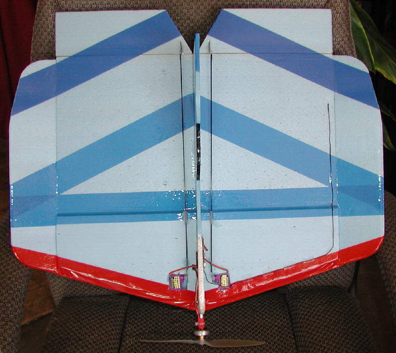 The HOOT is a design originated by Carl Voigt, with a discussion page on RC Groups starting HERE. As with any foamie design, many individuals have implemented a variety of adaptations; photos and details are on the discussion pages. This one which I built is an adaptation of the 'full size' version, with the total wingspan stretched slightly to 23", using wing tip panels 2-7/8" wide, and with a 2-1/2" deep lower EPP fuselage added (which was not included on the original design.). This one is now powered with a slightly largwer / heavier 'double stack stator' CD ROM brushless motor, flying on a 2 cell LiPoly battery pack, at a flying weight of 9-3/8 ounces on a 1000mAH pack. I am now flying it with an 9x6 APC SF prop.