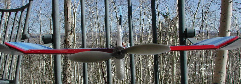 02-28-2006 : Flew the HOOT with the APC 9x6 SF prop for the first time; I definitely like the higher pitch speed this prop offers! Even though winds were up, it had good authority. I'll test the 9x7.5 SF prop soon. I also set up the high rates for a faster rool rate, & tighter loops, with positive results; now I'll continue to test shifting the balance point back another 1/16" at a time, to identify the optimum balance point for aerobatics while retaining enoughh stability for high speed flight.