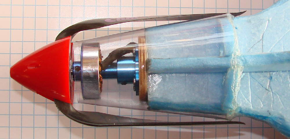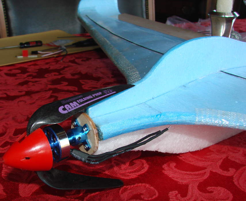 Above & below: the motor is now mounted in the motor mount on the firewall, with the folding prop temporarily slid in place. Some foam filler blocks will be contoured to fill the nose behind the firewall. Then flat polycarbonate plastic sheet (from a two litre soda bottle) will be formed into a conical motor fareing cowl and taped in place.