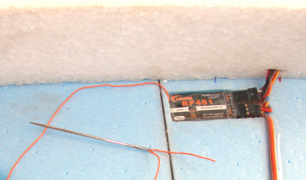 The next question was, what to do with a ~40" long antenna wire? I did not want to run it close to the 1 meter long CF rods in the wing- (they may be able to absorb and mask the radio receiver's signal, reducing range dramaticly, being very closely matched to the length of the antenna.) I finally decided to do a variation of what I've done on combat EPP slope ships as well as on the EPP Beagles. S I got out a large sailmaker's needle!