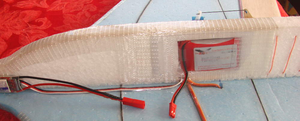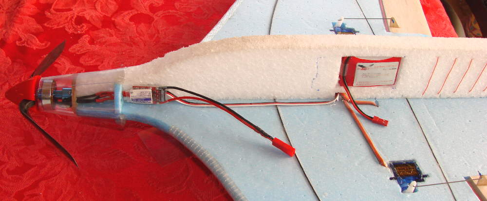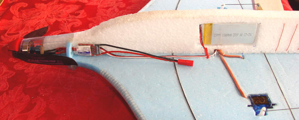Above: This shows the battery compartment cutout, positioned to carry a 2S 1300 mAH Zippy battery pack so that the aircraft is balanced at the desired point.