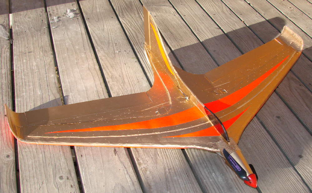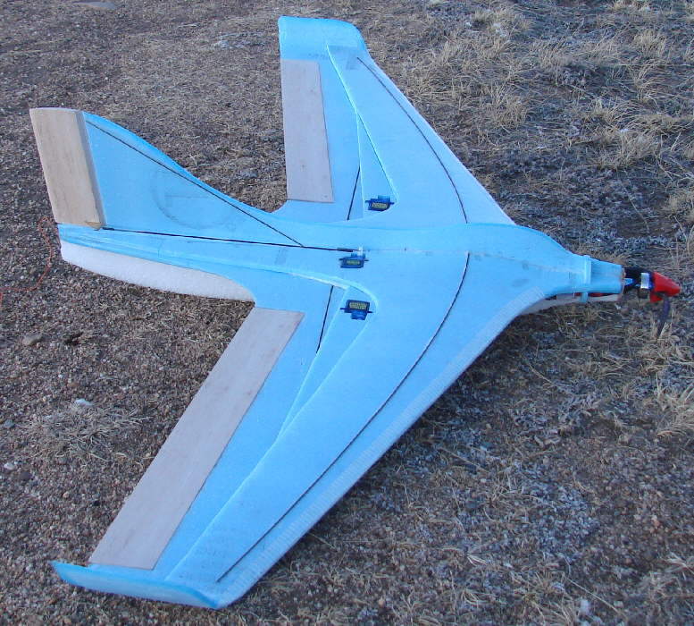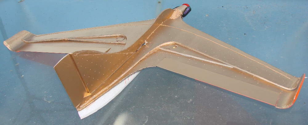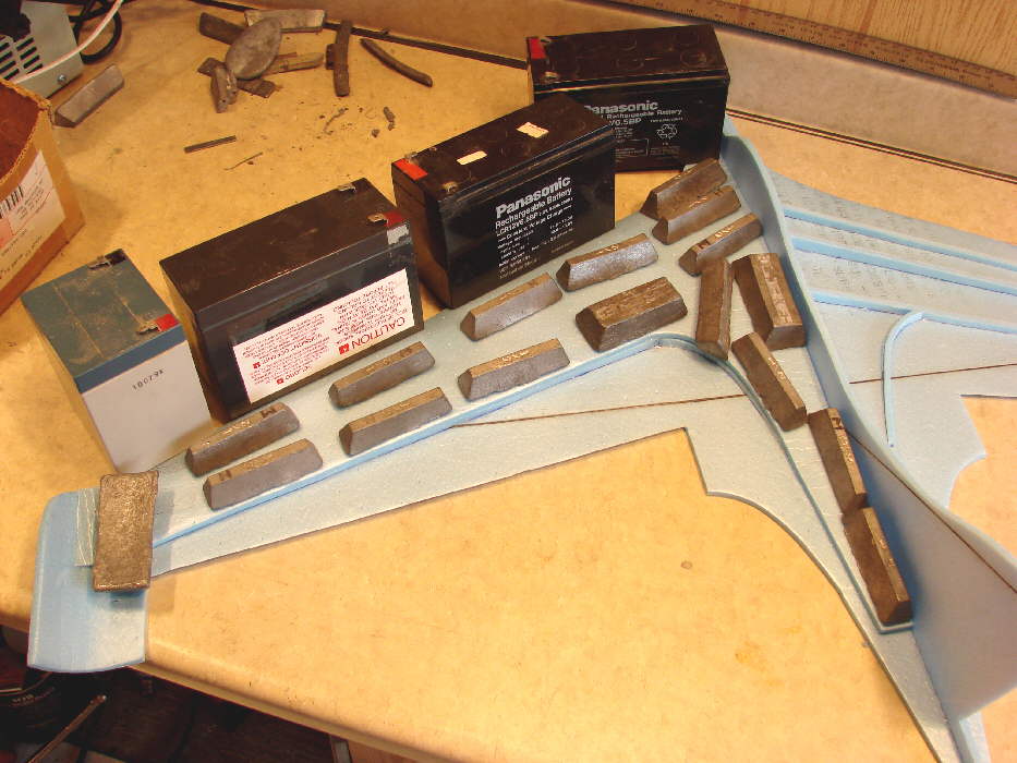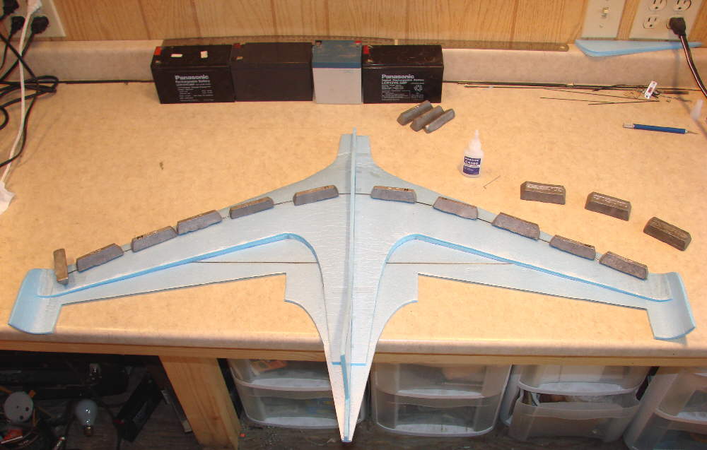 Above: some lead is temporarily taped in place, ready for test glides to establish the starting balance point of this particular wing. The elevons were taped in place with their top surface flush with the upper surface of the lower wing panel; the rudder was also taped in place. I actually taped on about 4 ounces of lead, then adjusted the positioning of some of it until the glide was smooth with no indication of either stalling / porpoising, or diving. I then marked this point as the balance point to use for first flights. Final balance adjustment will be accomplished by shifting the position of the flight battery.