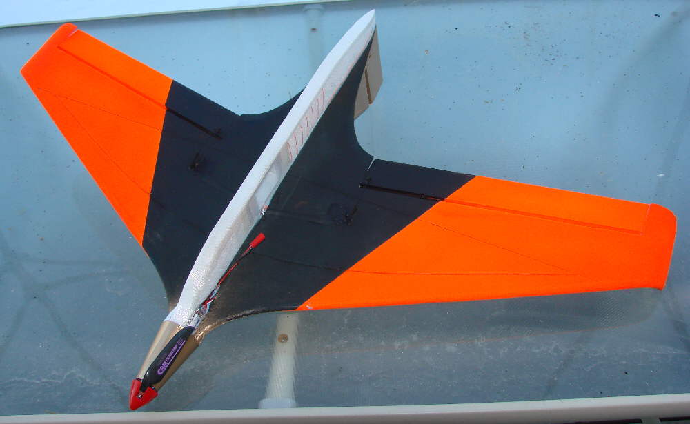 After flying the 2S packs for a while, I put in a 3S 900 ABF pack. WOW- with 50% more voltage, this Komet kicks butt!! It woke up & started REALLY covering some sky- much stronger vertical climb, faster airspeed, faster roll rate. This is the setup for fun flying, doing the power-on aerobatics in any air. I'll be flying these 3S packs when I feel like simply tearing up the sky! This pack, when installed to the rear of the battery compartment, shifts the balance back about ~1/4" from what's shown on the plans. A bit of the elevon reflex is trimmed out, and the throttle>elevator mix is reduced to +2%. It's definitely flying and gliding cleanly with this pack & balance point.