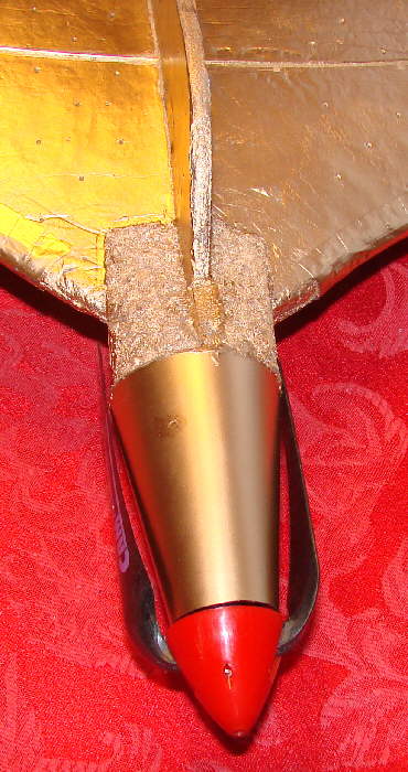 Above: I did some of the dress-up work on this Komet. The photos show the progress so far. I also added the EPP streamlining faring pieces just off the rear edge of the motor cowl. All three colors of spray paint are Pactra 'Odds-N-Ends' spray paint.Top surface now has a base coat of metallic gold, ready for trim.