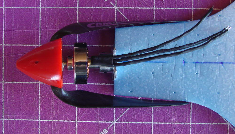 Above: Motor leads were routed through a close fitting cutout through the firewall before being soldered to the TURNIGY Plush 10A ESC. With the electronic components used and their positioning, the balance without the flight battery in place is very close to the ideal balance point. This allows placing the flight battery close to the balance point, keeping the mass centered, and allows use of various sized batteries in that position without changing the balance of the aircraft. Once final balancing range is verified, a battery compartment will be cut into the EPP foam, so that the flight battery will be inside, out of the cold winter air, protected during landings, and not causing any drag.