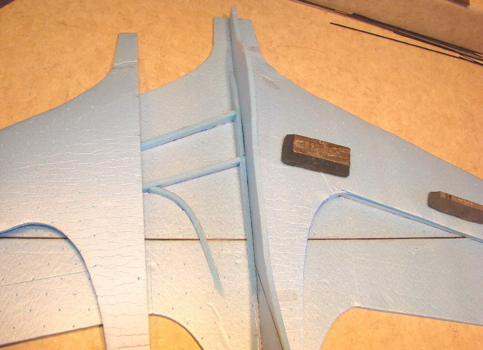 (Above:) There are also a pair of 1mm CF rod stiffeners inset into either side of the vertical stabilizer's leading edge for stiffness. The soldering iron was used again to make the shallow channels for these stiffenwers, These are glued in place with foam-safe CA glue. It's easiest to install these before the upper fuselage is glued to the main lower wing panel.