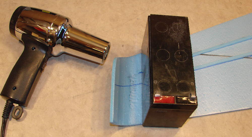 Above: This shows the 2S 900 mAH battery pack in the same cutout, with a filler in the forward end to position this smaller battery correctly for proper balance.