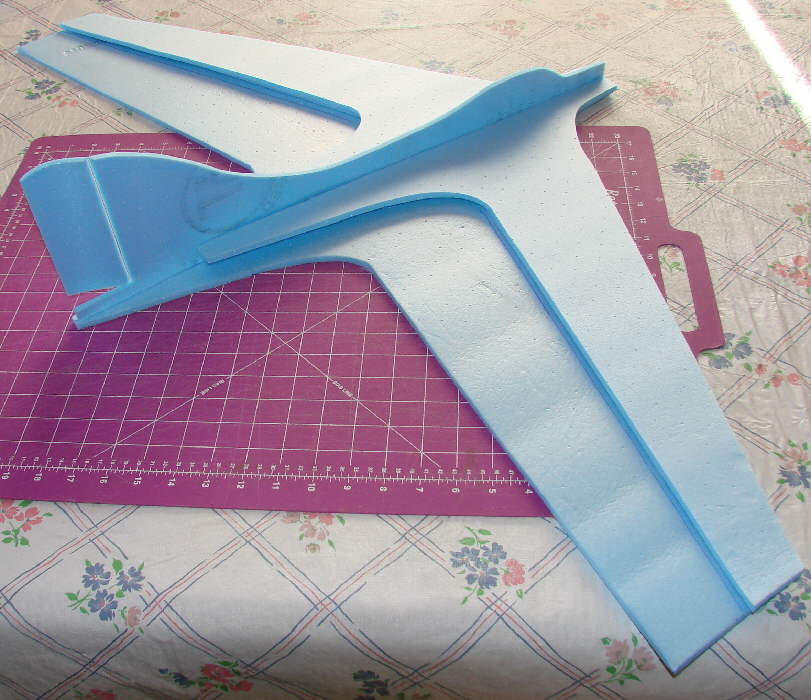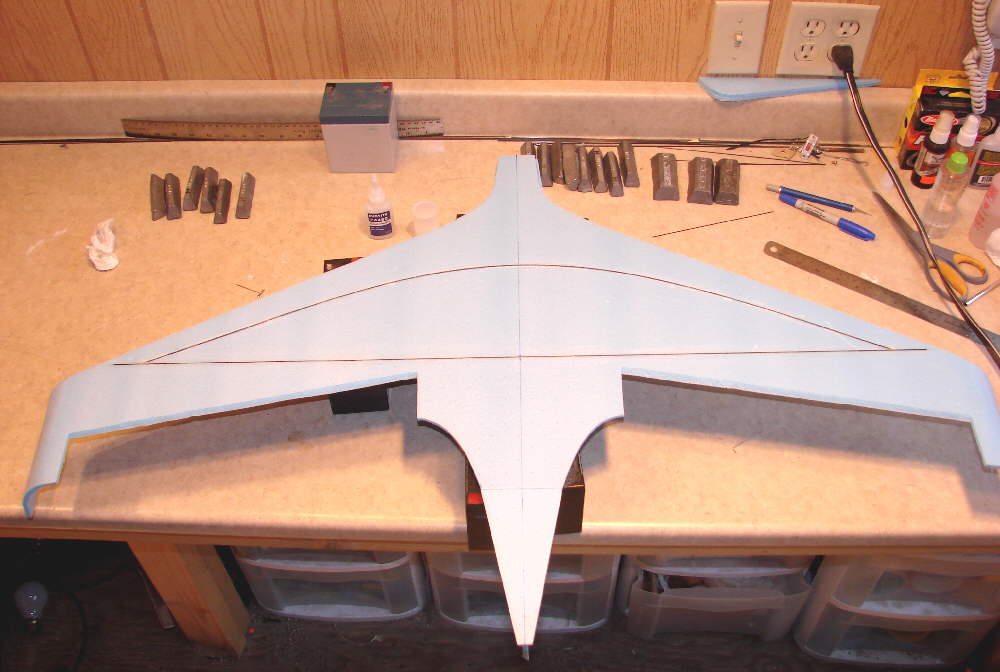 If this build project looks a bit more complex than many 'quickie' foamy builds, I'll say that the build is still fairly simple. There are just three extra airfoil-shaping strips installed between the lower and upper wing surfaces on each half of the wing, and a fair amount of foam shaping involved.