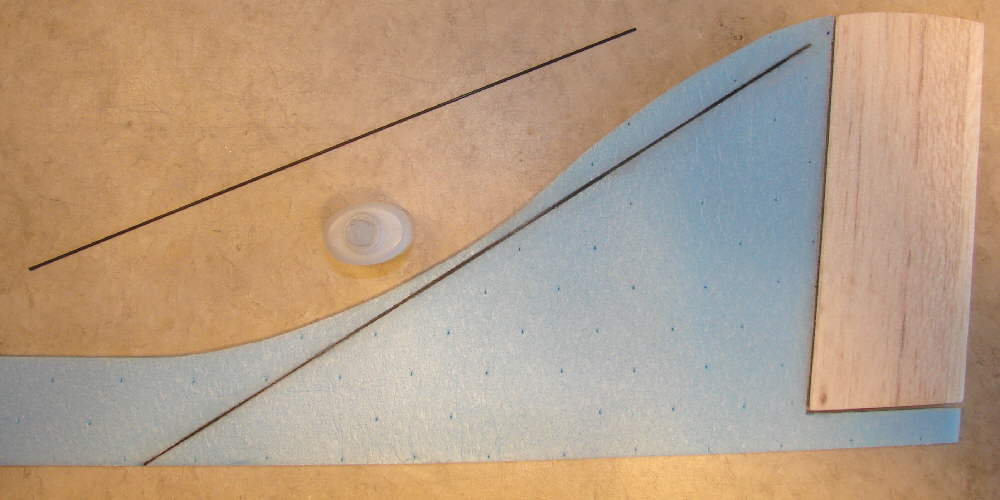 This photo also shows the 1/4" x 2" balsa rudder that has been cut to fit; I actually extended the trailing edge a bit more with some 3/32" sheet balsa . The balsa of the rudder was then sanded to a very thin trailing edge to minimize drag, & also matched to the 5mm thickness of the Bluecor vertical stabilizer at the forward edge. I covered the bare wood with thin Doculam film before tape-hinging it in place.