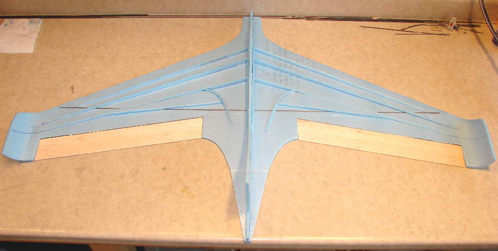 In the photo above, the top surface CF rod spar is being glued into it's depression in the foam with foam safe CA glue.