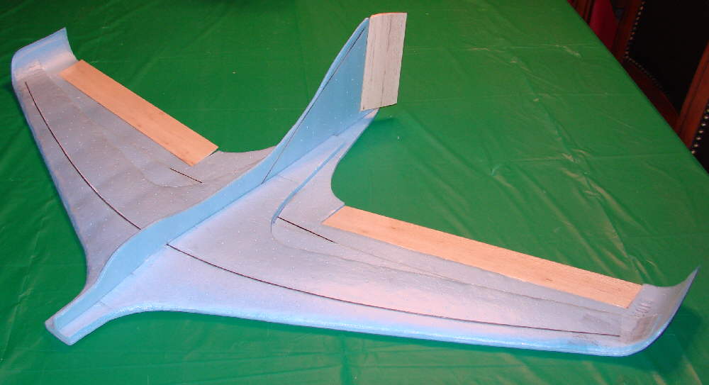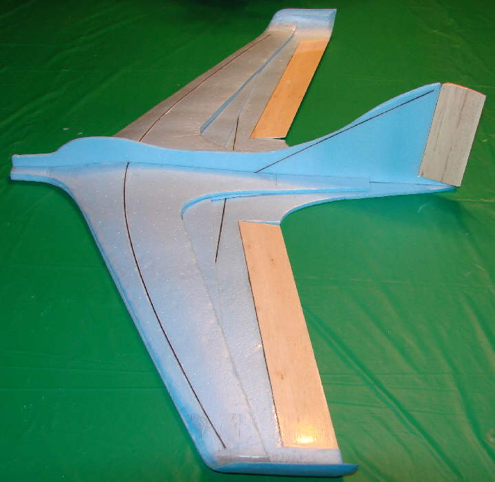 (Above) : The 1/4" x 2" tapered balsa elevons have been further sanded and shaped, with some of the upswept trailing edge reflex formed. The trailing edges have been shaped to a very thin edge to minimize drag. They have also been matched to the Bluecor's thickness at the hinge line. The Bluecor of the main wing panel itself has been cut on a ~50 degree bevel; there is no bevel on the balsa elevon itself. Once sanding and shaping was completed, the elevons were also covered with the thin Doculam film. The elevons were then tape-hinged in place with Scotch multi-purpose clear tape; I use 1/2" wide tape on the top surface full-length, then add a full length strip of the 3/4" wide tape on thwe underside of the hinge line. (Be sure to leave a 1/32" gap between the wing and elevon edges when applying the tape hinging, to provide clearance for the tape when the elevon id deflected full down.)