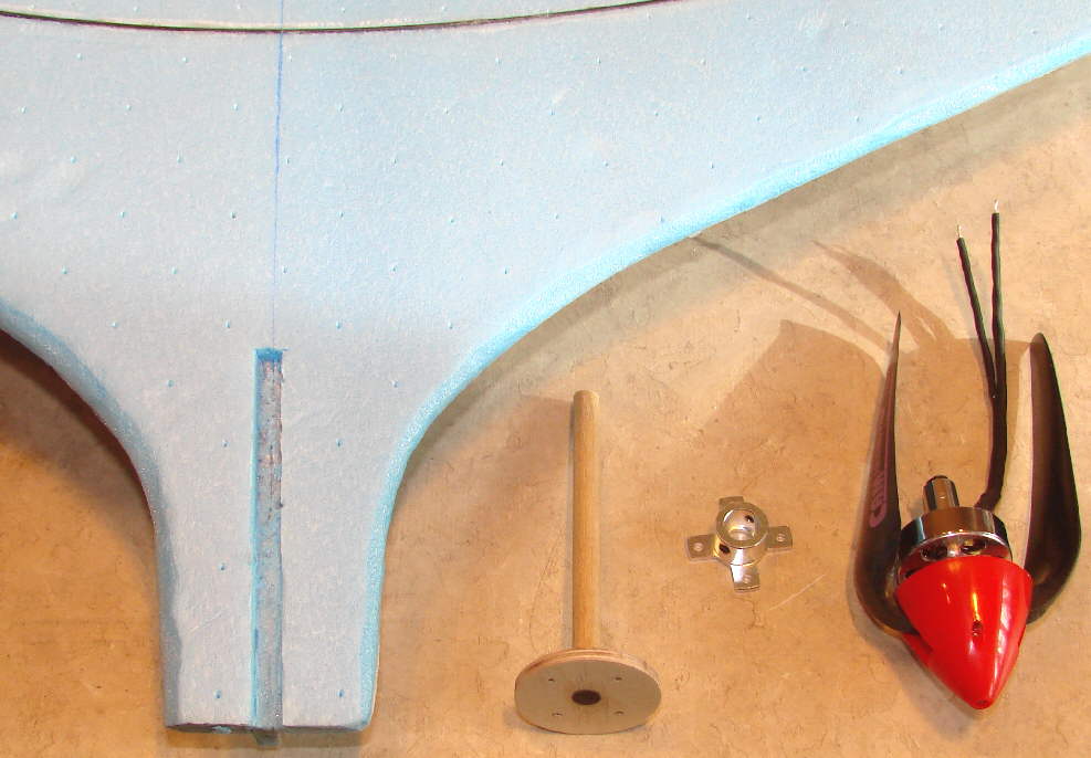 I have decided to start flying this Komet with a 24 gram 2712 motor, 1500 Kv, turning 9x4.5 Graupner CAM folding prop blades on a narrow spinner. The nose has just enough length of the slim area behind the motor for the prop blades to fold in cleanly. (Adding the tapered conical motor cowling will be one of the last steps in the trim-out.) This firewall mount approach allows a variety of motors & props to be used.