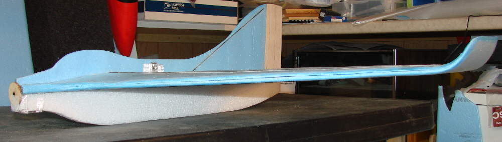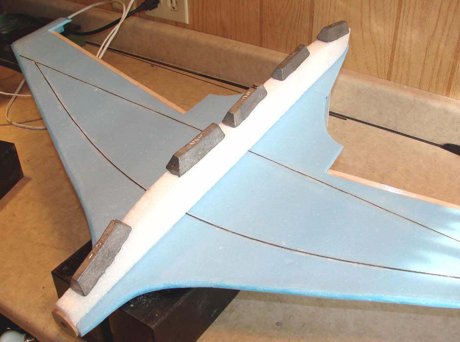 ABove: The EPP foam lower fuselage is being epoxied in place, well weighted down with 1/2 pound lead blocks. This may seem to be a bit larger lower fuselage than might be needed... but until I have verified the final position of the flight battery and cut in it's compartment within the foam, I want to keep the extra foam. I'll then trim, carve, sand, and cover the final shape of the lower fuselage with either trim tape or Doculam film.