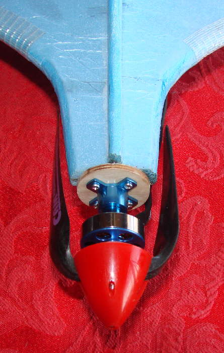 Above: four pieces of Bluecor foam wer shaped and glued in place where the folding propeller blades come in around the forward fuselage. This not only will keep the blades from hanging up on the initial test flight, but forms some of the support structure for the conical motor cowl / fareing which will be added later.