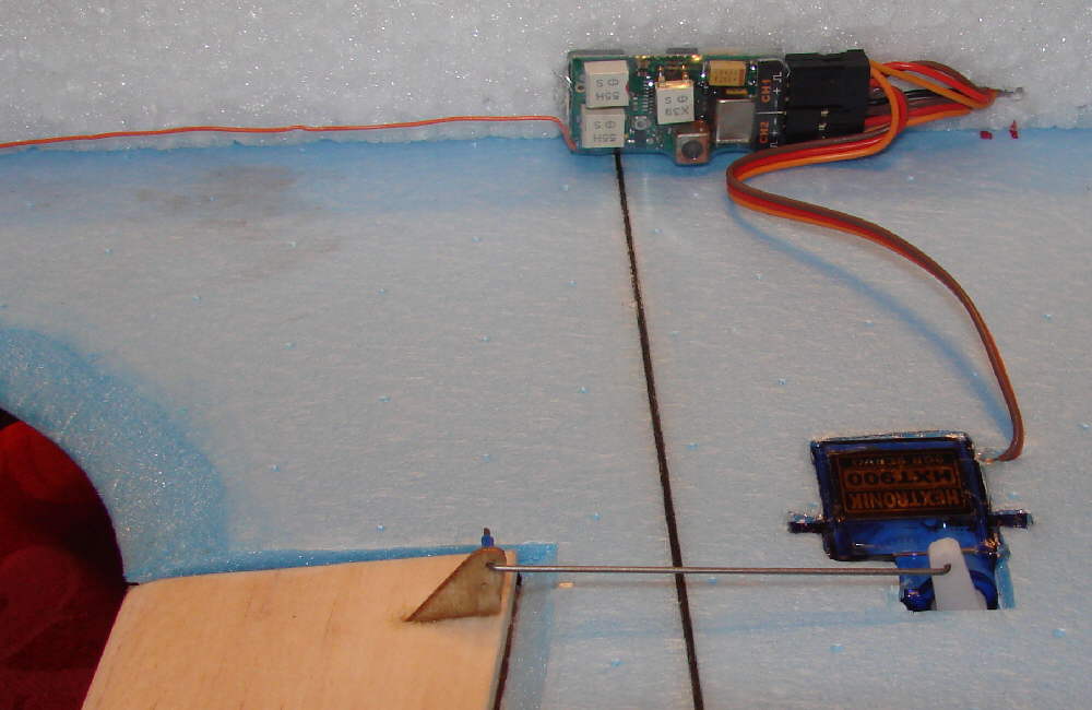 Above: The rudder servo is an HXT500 '5 gram' servo; I use a length of 1.5mm CF rod for the linkage with 1/32" music wire ends secured in place with heat shrink and CA glue. Elevon servos are HXT900 9 gram servos; as placed laid flat, their cases are flush with the lower surface of the wing, and flush with the top of the secondary KFm3 step pannels.