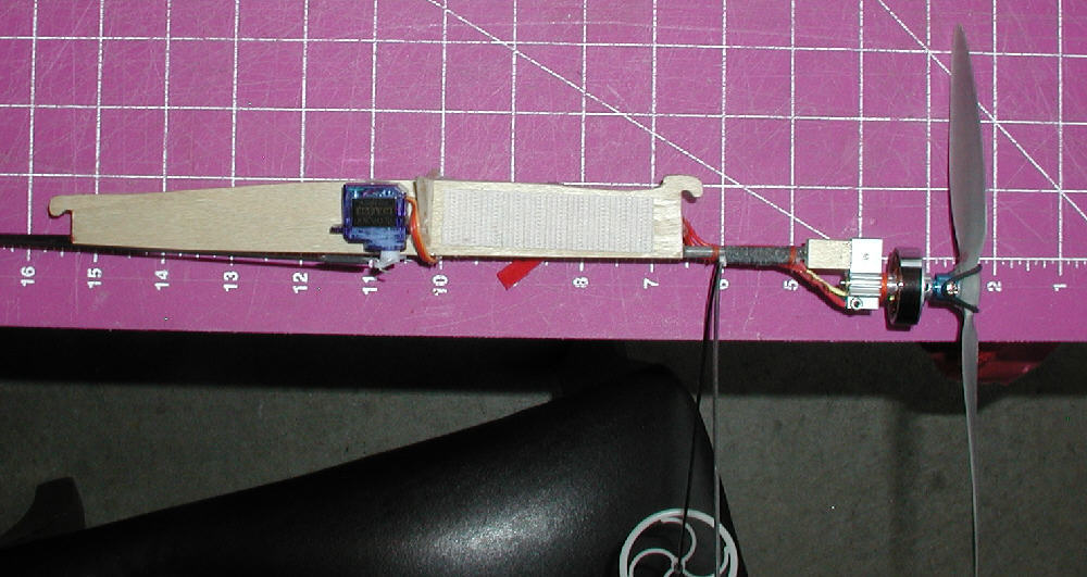 Here's a photo of the wing riser, and the motor mount. I wanted the wing riser to be tall enough so that the servos could be mounted (simply glued) against the sides, and tall enough to mount the receiver and ESC on the left side, and to carry the flight battery on velcro on the right side. The 'balancing act' was focused then on how far forward the motor would be mounted, with the various sized 2S LiPoly battery packs being able to be adjusted in their placement to achieve final flight CG trim.