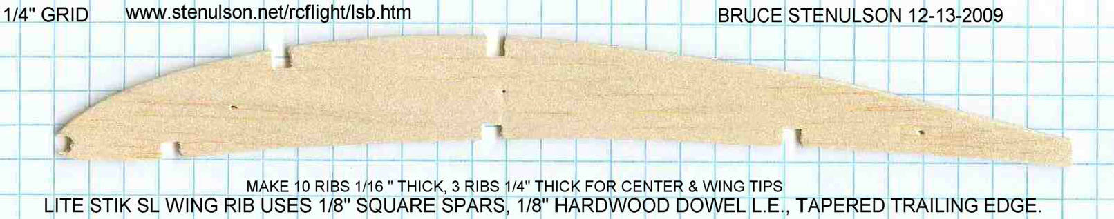 But pulling together all of my drawings & sketches, and completing a full set of plans is a project that I might complete at some piont. I have now added the wing rib layout and the wing riser template to this web page. those key details, along with the photo of the tailgroup plans and a few extra dimmensions should give you enough info to build one. (You may have to draw out your own simple wing layout plan... it's easy to do on a constant chord wing. Wing rib spacing is at 3"; the wing tip ribs and the one at the center are 1/4" thick, while all of the other ten ribs are made from 1/16" balsa. Be sure to make the small triangular gussets for where each rib butts against the tapered trailing edge- this really strengthens this vulnerable area of each rib very nicely.