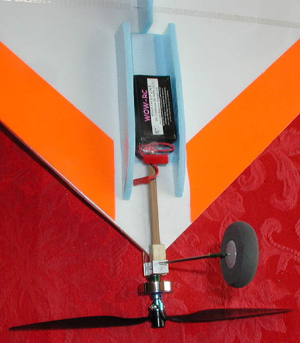 Total area is about 2.68 square feet, so wing loading is at about 3-3/4 ounces per square foot. With the present battery system, the power loading can be run up to around 90 watts per pound, depending upon the prop being flown.