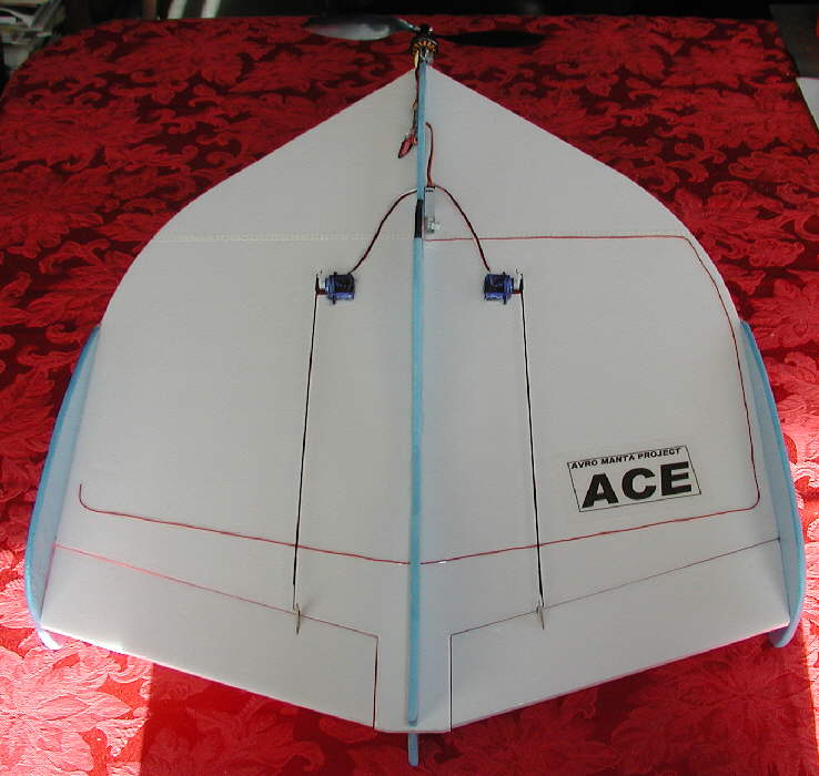 After having the second Manta Omega prototype come in at a flying weight of 11-3/8 ounces, I decided to use the extended pointed nose profile on this rendition of the ACE to locate the motor and flight battery farther forward from the ideal CG point. The wing is made from a single layer of 6mm foam that was purchased from BPHobbies back in 2006; it has a white foam core with a plastic surface film on both top and bottom. It has enough rigidity so that no span-wise spars were required.