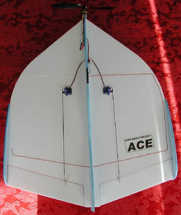[Dec. 8th, 2006] My Manta is flying great; with the weight of the clear vertical stabilizer, it took the pair of 2S 850 mAH Li-Ion packs way up in the front to achieve balance- about three ounces of batteries, for a flying weight of 10-3/4 to 10-7/8 ounces. It has more area than a similar diameter UFO, modest wing loading, & excellent slow flight handling.