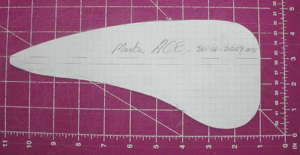 [Dec. 11th, 2006] My MANTA is 20" wide, 24" long to the trailing edge of the elevons; I'm flying with the balance at 6-3/4" to 6-7/8" back from the front edge of the Bluecor.