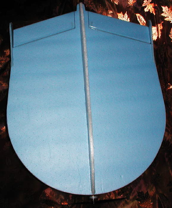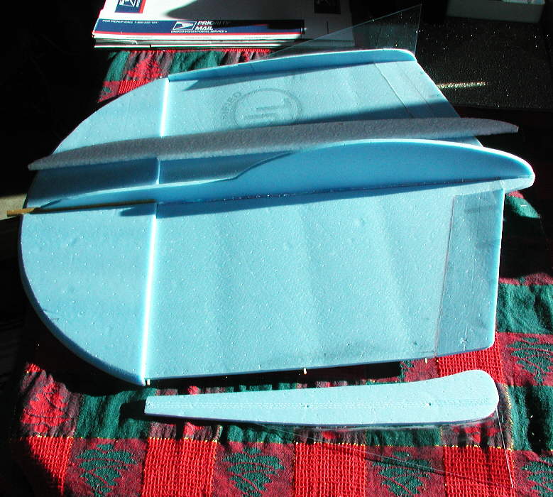 The rear cockpit panels are a maximuum of 2-7/8" high, and about 14-1/2" long, attaching into the rear of the forward gear compartment. At their widest spread at their base, they are set about 1-1/4" wide. They are glued to both sides of the clear polycarbonate vertival stabilizer fin with CyA, after having first been glued to the deck / wing with hot melt glue.