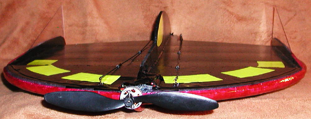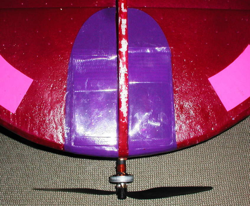 The .030" thick clear vertical stabilizer is glued in place between two pieces of 1/4" balsa triangle stock; the motor mount shaft is a 12" section of 1/8" O.D. C.F. tube, with a plastic bushing added to the front end. There is a 1.5 mm diameter x 1 meter long carbon fiber rod laid in around the disc's edge, centered on the front.