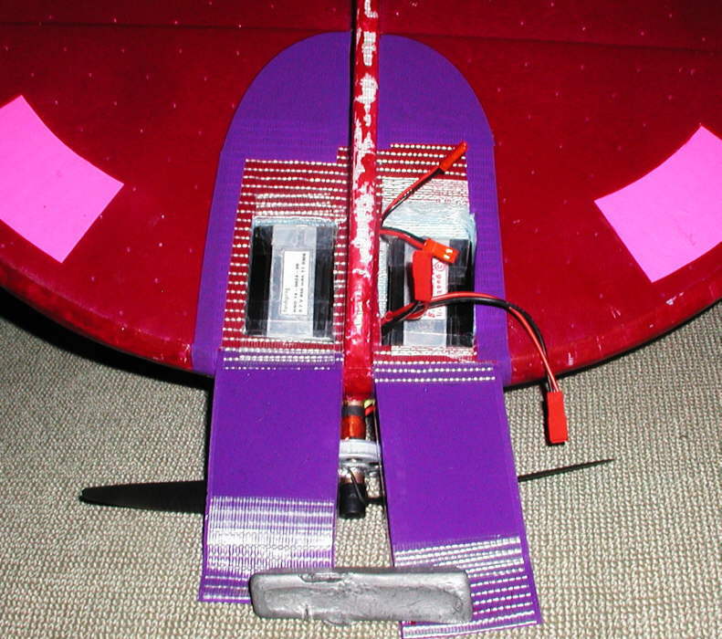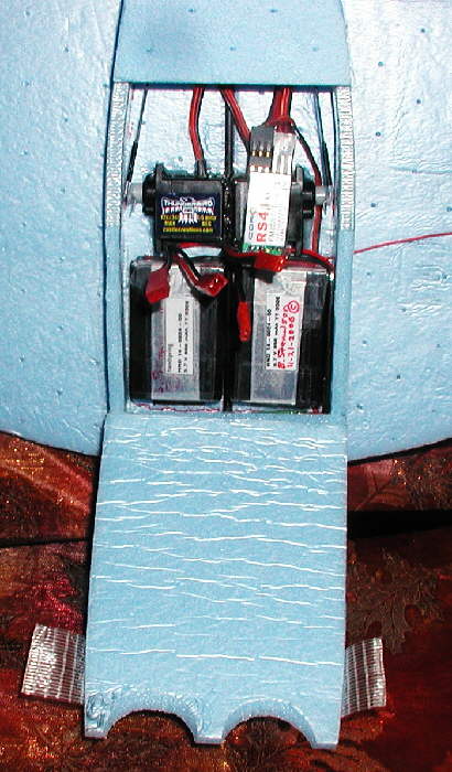 Here's a closeup view of the battery mounting compartments on the underside of the MANTA; there are now two, one on either side of the EPP underbody, which extend most of the way through the triple layers of Bluecor towards the top surface. (I needed the weight of the two 2S 850 mAH packs to bring the balance farther forward, and having the weight distributed equally laterally should help in slow speed flight handling. These packs weigh 44 grams each- good energy density.)