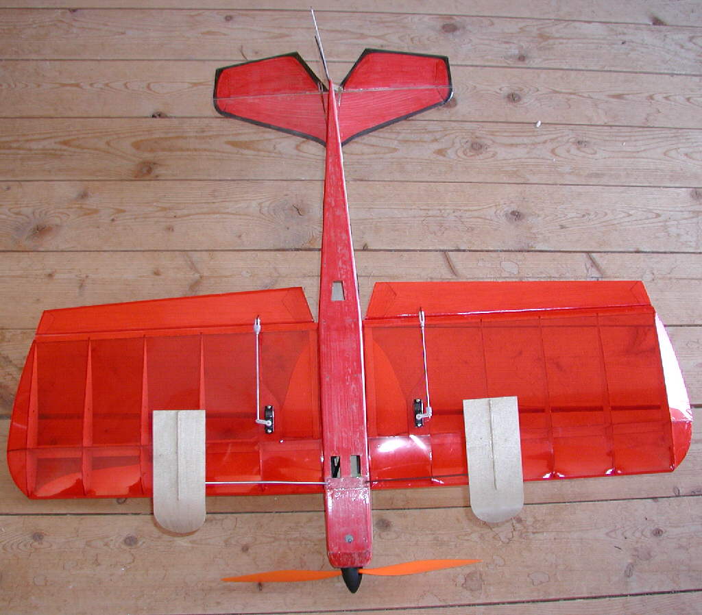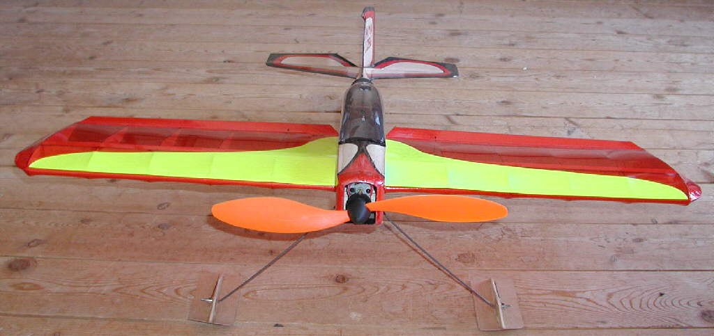 It's winter flying season as these photos are taken, so my MINIFLASH is on skis, on longer-than-stock landing gear legs. I did most of the 'artwort' on the bare wood structure of the fuselage, then covered it with clear Doculam material. The wing is covered with Ultracote light transparent film. The Flourescent Yellow Ultracote was added to the top surface of the wing to add extra aircraft 'attitude definition'- this one is set up with a fast roll rate & radical control throws, taking advantage of the Exponentials on my computer transmitter to keep it handling smoothly at modest control stick deflections.