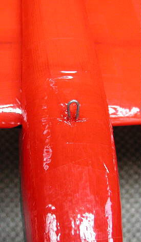 This BD5 is now also set up with a bungi launch tow hook (see further info below.) The hook is lacated at the leading edge of the wing, taped to the wing with strapping tape, and then covered with more of the colored packaging tape. The BD5 handles very nicely on the bungi launch- smooth and predictable!