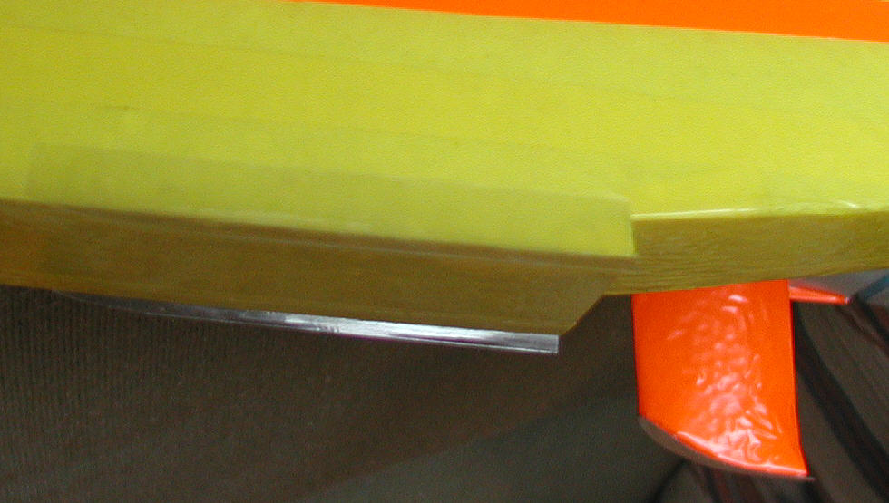 Boat Hull running surface sheeted with 1/64" birch ply, & entire hull waterproofed with plastic tape covering