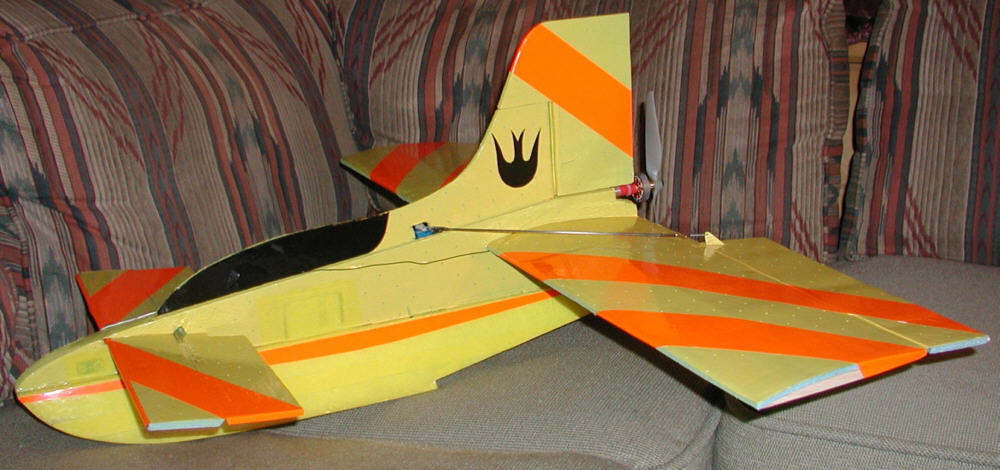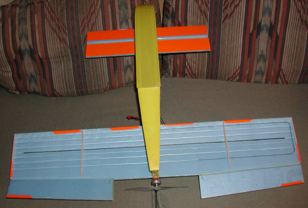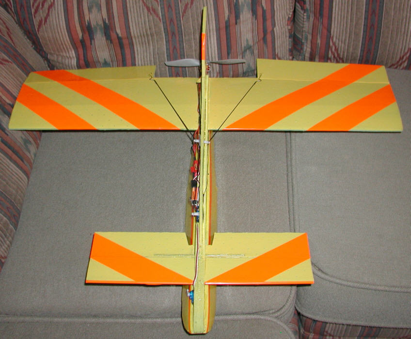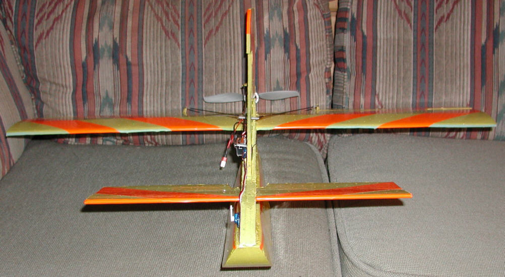 The motor is a 'single stack' CD-ROM motor built for me by Keith Brown of LaPue Skunk Works; it's wound to run on 2 Lithium cells. I'm using an APC 7x4 propeller for initial flights. The ESC is a Castle Creations Thunderbird 9.